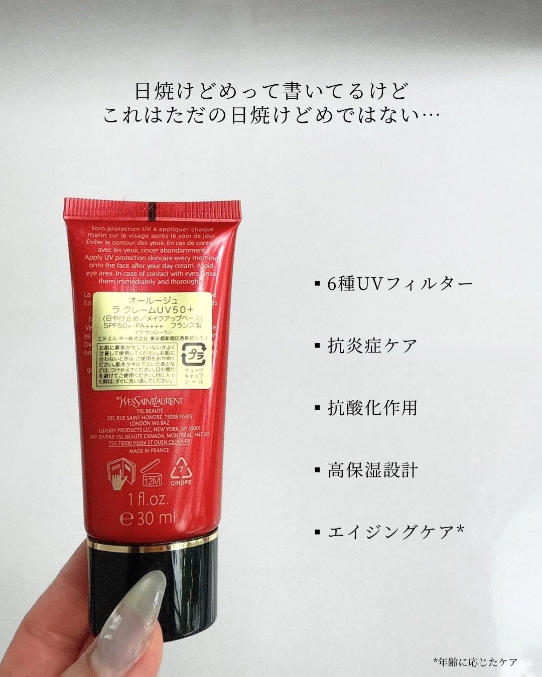 | 商品の特徴 | 日焼け止め|UVケア|オールージュ ラ クレームUV50+|イヴ・サン。イヴ・サンローラン / オールージュ ラ クレーム ユーの公式商品。イヴ・サンローラン / オールージュ UV50の公式商品情報|美容。【メーカー】イヴ・サンローラン Yves Saint Laurent 【商品名】オールージュ ラ クレームUV50+ 30ml【補 足】日やけ止め・メイクアップベース【定 価】15,950円(税込)【購入時期】2025.6写真撮影のため箱から出したのみです神経質な方は御遠慮ください【商品説明】SPF50+/PA++++すばやく*1明るい肌印象へ整えるハイプロテクションUV。試してみた】オールージュ ラ クレームUV50+ YVES SAINT LAURENT。独自成分サフランエキス*²、サフランウォーター*³を配合。。紫外線や外的ストレスのダメージから肌を守りながら、至福の潤いで肌を満たし、ハリ感を与えます。ディオールスキン フォーエヴァー スキン パーフェクト スティック 1.5N。潤いと輝きに満ちた肌へ。クレ・ド・ポー ボーテ タンフリュイドエクラ マット 35ml。【使用方法】メイクアップの前にパール粒1粒分を顔全体から首筋にかけてなじませます。ハクアリード ホワイトニングファンデーション・ホワイトニングクリーム。*1:メイクアップ効果*2:サフラン柱頭エキス(整肌成分)*3:サフラン柱頭水(整肌成分)SPF···50〜即購入○お値下げ× | ||